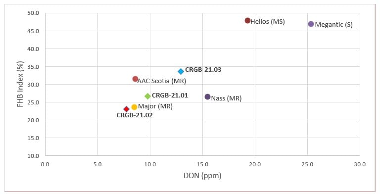 In the 2022 field season, the last year of this cluster project, two lines were in the last year of Quebec registration trials (third year trials), CRGB-20.01 and CRGB-20.02. The last had grain yield (101.5%) comparable to the CERS checks AAC Harlaka and Touran, and good resistance to powdery mildew, stripe rust, and barley yellow mosaic virus. The line had symptoms of FHB and DON levels similar to or better than the MS checks (Table 1), but it did not pass the Quebec FHB threshold to be supported for registration.